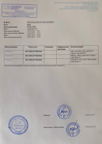 Справка с результатами анализа на гепатит А, В, С может потребоваться в самый неожиданный момент, когда времени на ее оформление нет. Обратившись в нашу компанию, вы можете купить и получить готовый документ за 24 часа, что обойдется вам в 1200 рублей, если справка будет оформлена в частной клинике, либо в 1500 рублей, если справку выдаст государственное медучреждение.
