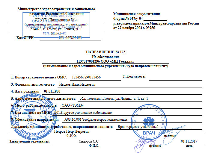 Направление на госпитализацию (форма 057/у-04)