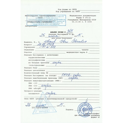 Анализ крови - реакция Вассермана (RW) и др. (форма 241/у)